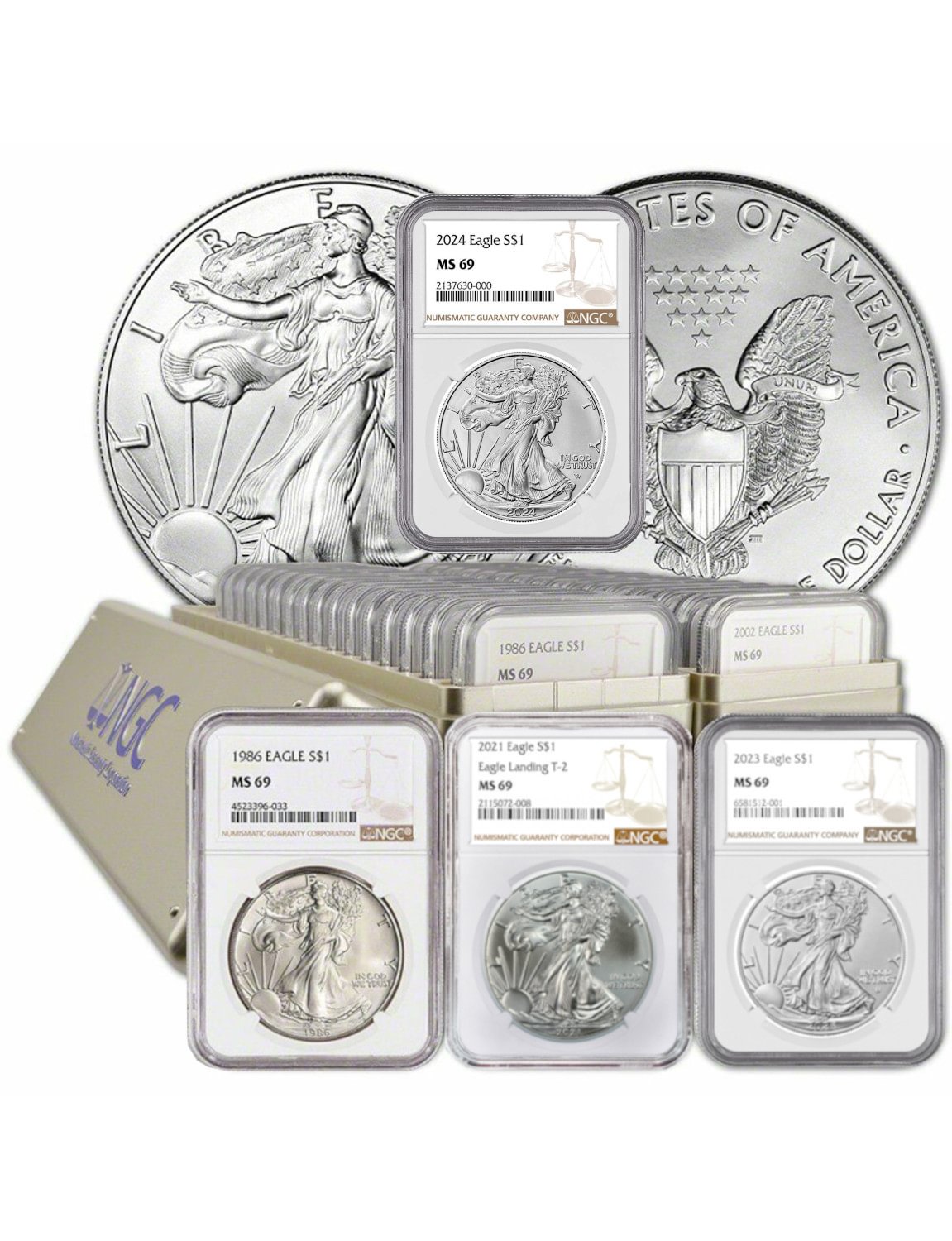 This?1986-2024 American Silver Eagle Set has been certified and graded by NGC as MS69. NGC's encapsulation guarantees each coin's outstanding MS69 condition.?To ensure the safekeeping and display of your treasure, each set includes two brand-new NGC boxes. This is one of our most popular collector's sets. Don't let this opportunity pass you by; this exquisite American Eagle set is a true masterpiece.